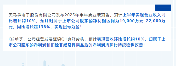 天馬微電子股份有限公司發(fā)布2025年半年度業(yè)績預(yù)告,預(yù)計(jì)上半年實(shí)現(xiàn)營業(yè)收入同比增長約10%,預(yù)計(jì)歸屬于上市公司股東的凈利潤區(qū)間為19,000萬元-22,000萬元,同比增長超138%,實(shí)現(xiàn)扭虧為盈!Q2